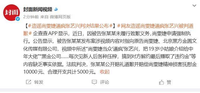 公告显示,被告张某某发布案涉视频内容对指向原告尚雯婕、北京黑方金圆文化传媒有限公司,视频中所述“尚雯婕当众‘逼疯’张艺兴,把19岁小姑娘介绍给中年大佬”“黑金公司……每次见新人后各种压榨,搞到对方解约最后赚取了违约金”等内容缺乏事实依据。
